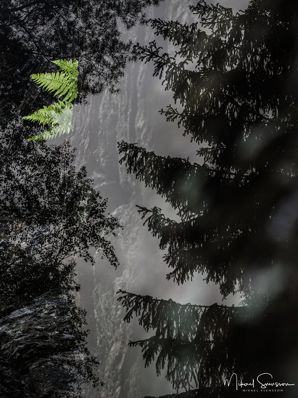 Bilden är skapad som en dubbelexponering, där flera motiv från skogen möts i samma bild. Siluetterna av granar och lövverk bildar en mörk ram runt motivet medan en klippvägg och dimliknande ljus skapar djup i bakgrunden. I kontrast till de mörka formerna lyser en grön ormbunke upp bilden och blir ett naturligt blickfång.