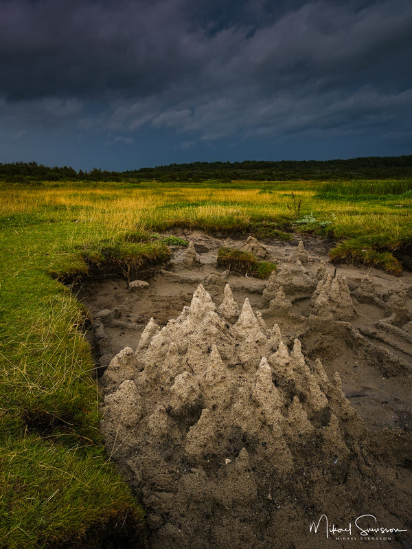 När jag kom fram drog mörka moln in över kusten. Himlen blev dramatisk och ljuset över strandängen skiftade snabbt mellan ljus och skugga. Kontrasten mellan det lilla sandslottet i förgrunden och den tunga himlen ovanför gav motivet en nästan surrealistisk känsla – som ett litet landskap i miniatyr framför den stora naturen.