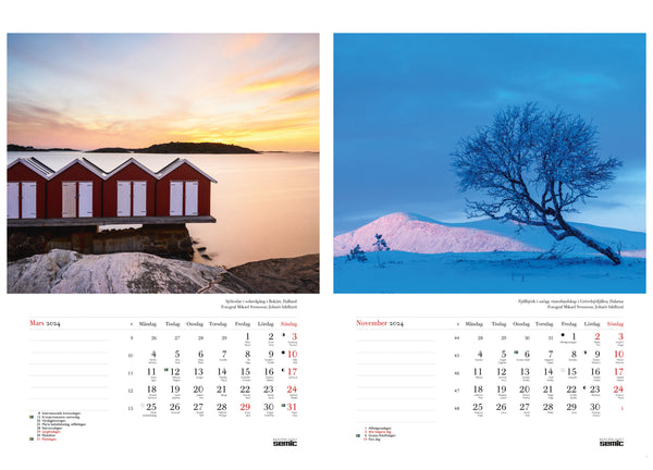 Stämningsfulla årstidsbilder från olika delar av Sverige, fotograferade av våra skickligaste naturfotografer! Varje månad representeras av en svensk landskapsbild. 2024 års kalender innehåller bland annat natursköna bilder av sommaridyll vid Huvudskär i Stockholms skärgård, höstliga färger på Höga kusten, sjöbodar i solnedgång i Bukärr och en fjällbjörk i Grövelsjöfjällens vinterlandskap.