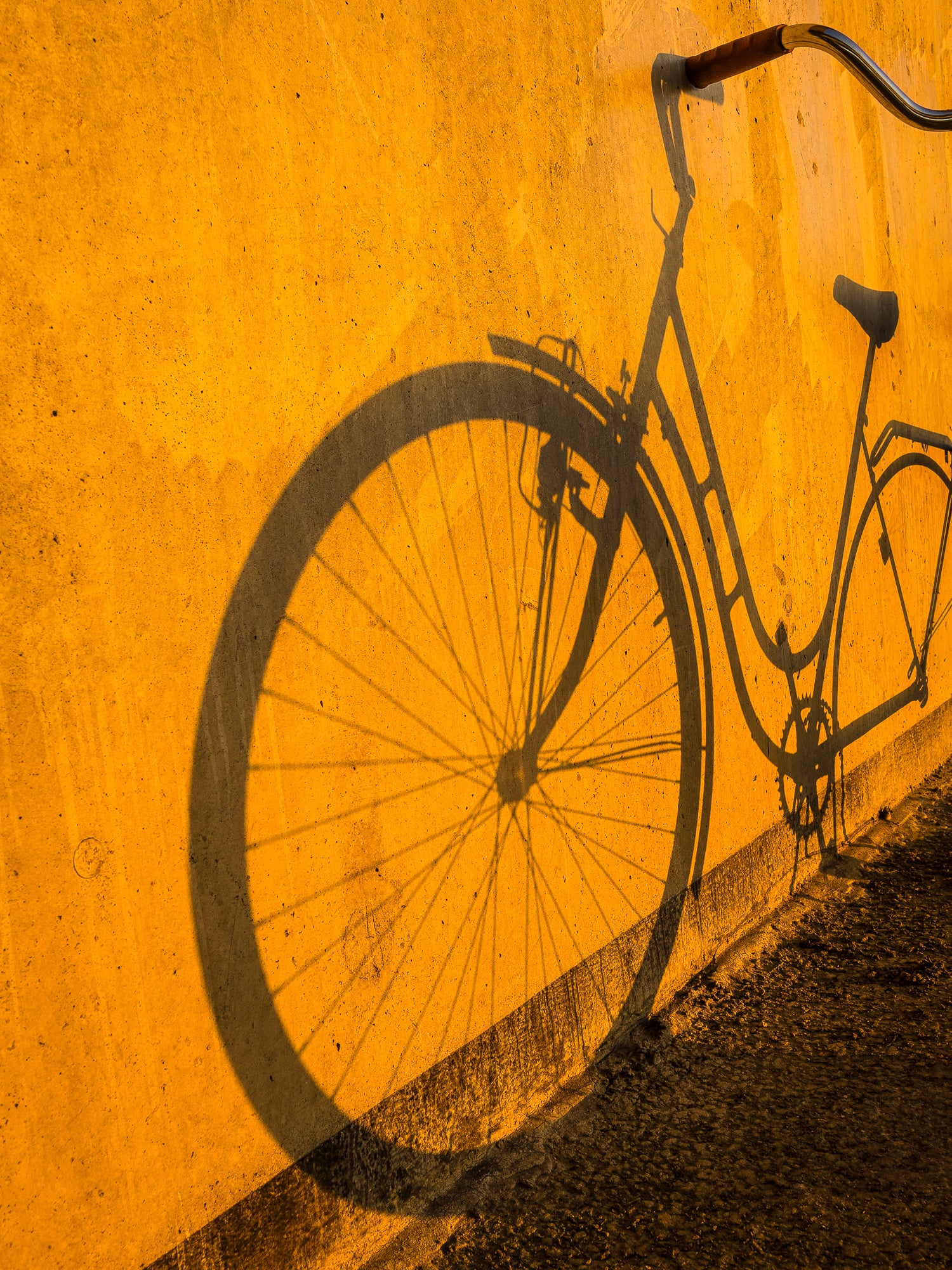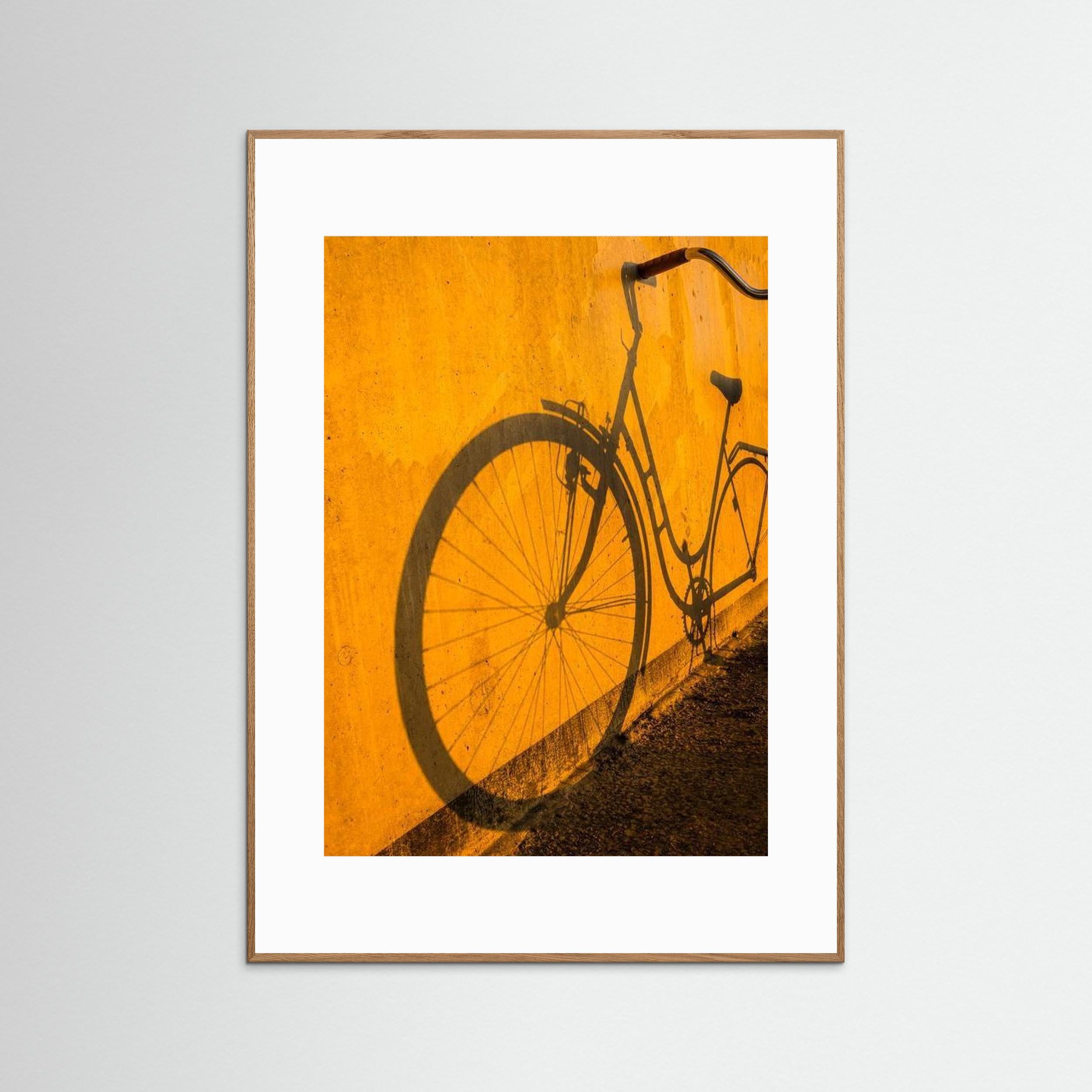Fotograferad den 20 maj i Göteborg. Ett ögonblick av vardag förvandlat till ett grafiskt och minimalistiskt konstverk. Kvällssolens låga strålar kastar cykelns skarpa skugga mot en varm, gyllene vägg – där formen nästan blir viktigare än föremålet självt.