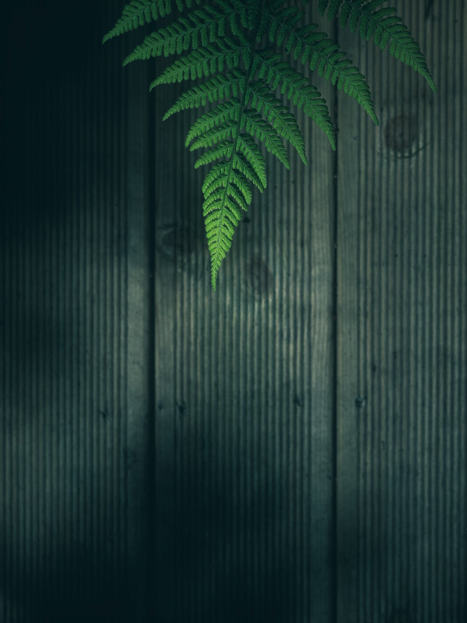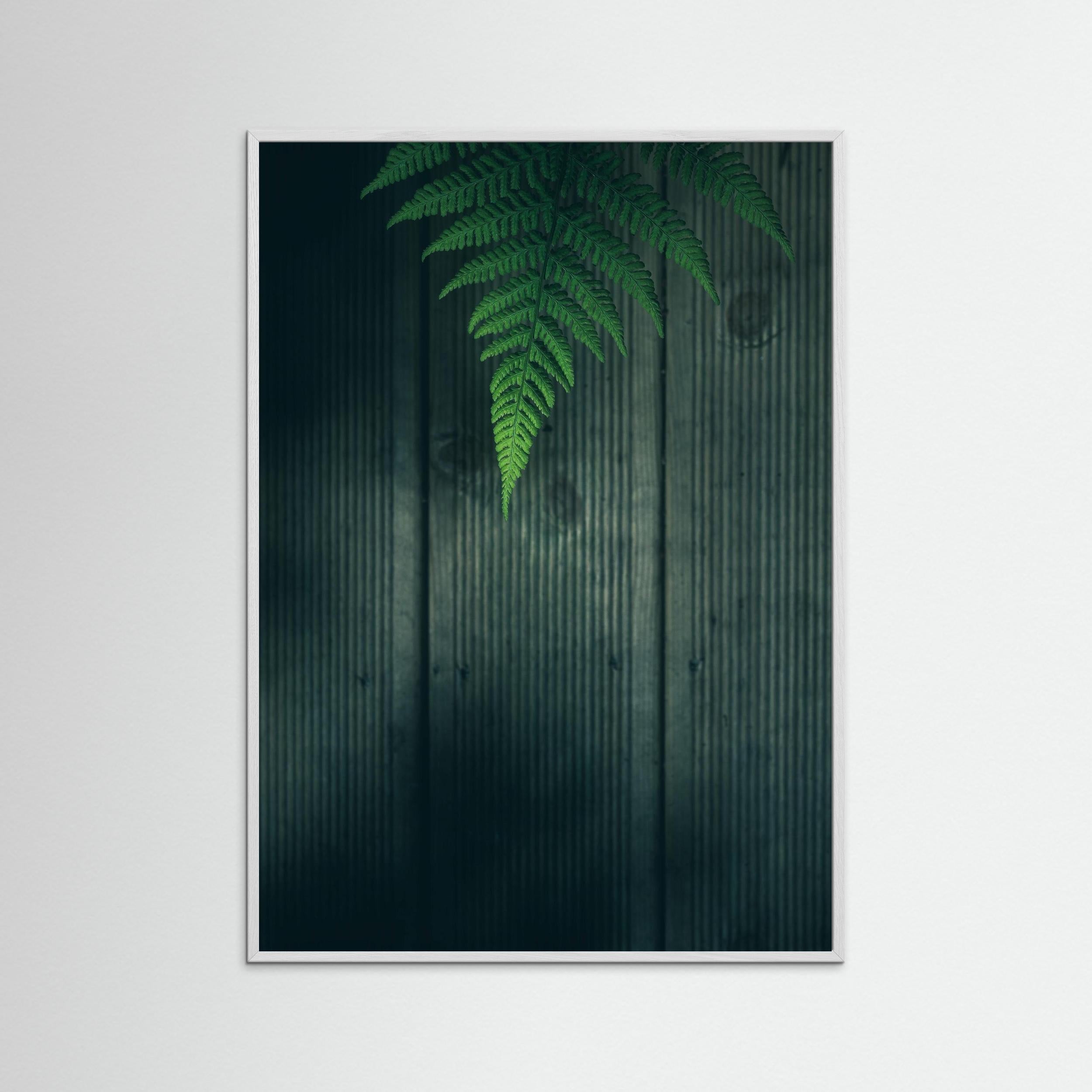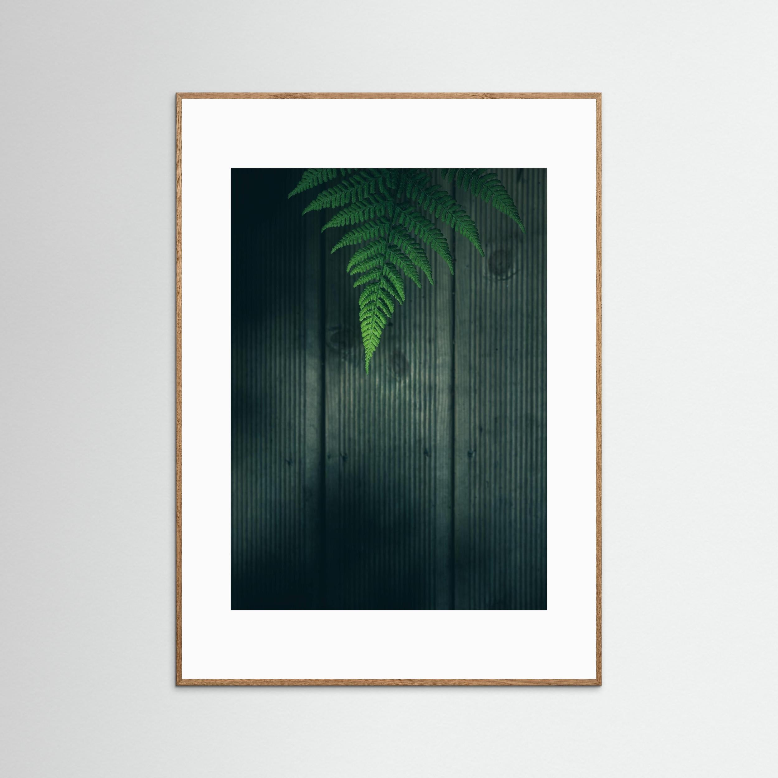 Ett stillsamt naturmotiv från Rya skogs naturreservat på Hisingen i Göteborg, där ett grönt ormbunksblad sträcker sig ut över en träspång i den gamla skogen. De djupa gröna tonerna och den enkla kompositionen ger bilden ett lugnt och minimalistiskt uttryck.