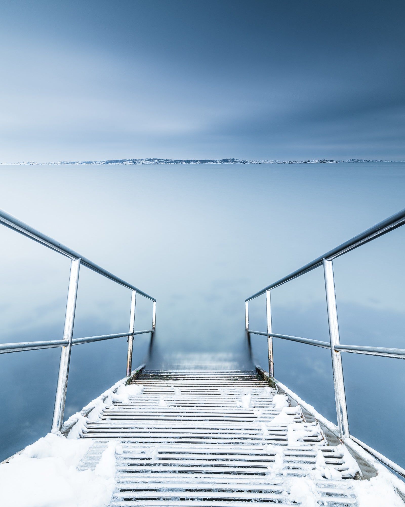 De raka linjerna från räckena och trappan leder blicken ut mot horisonten och ger bilden ett grafiskt och balanserat uttryck. Den snötäckta bryggan kontrasterar vackert mot de svala blå tonerna i hav och himmel.