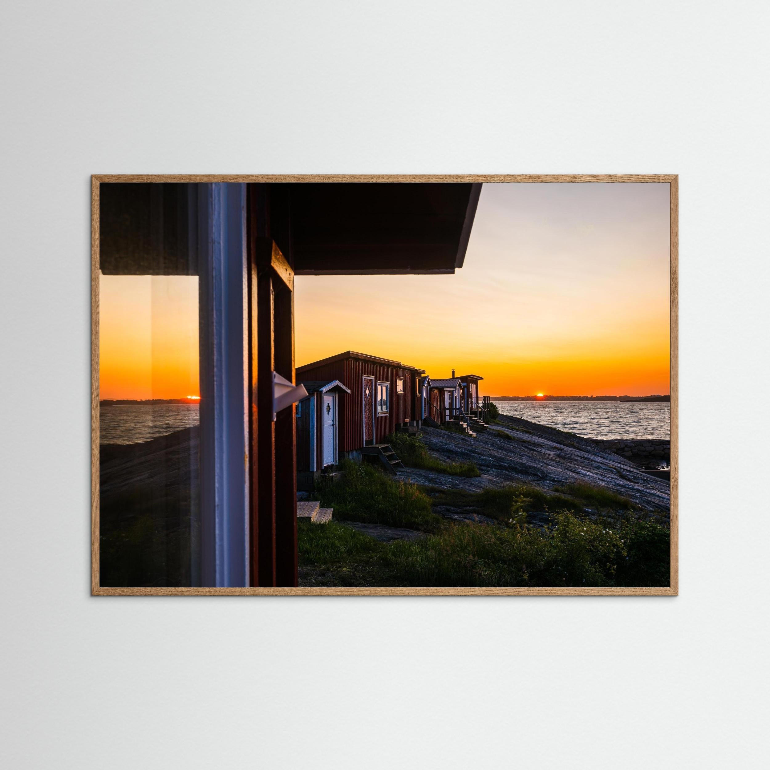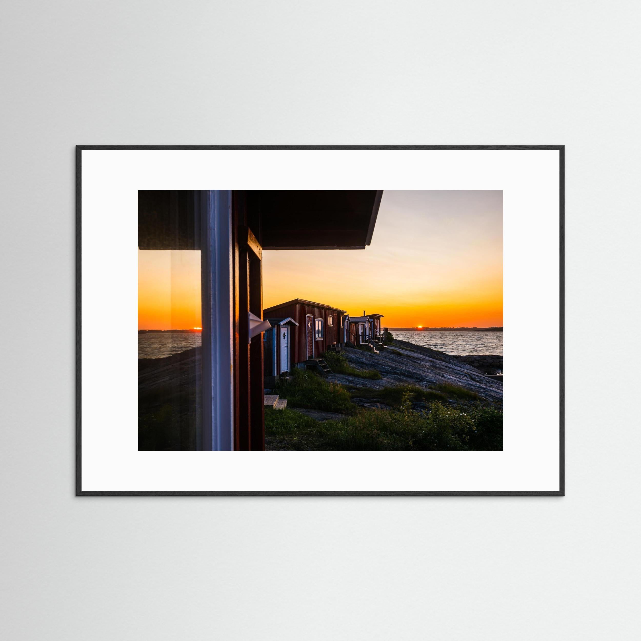 Motivet fångar känslan av en stilla sommarkväll vid havet, där solen sjunker ner över horisonten och sjöbodarna ligger tysta längs klipporna.