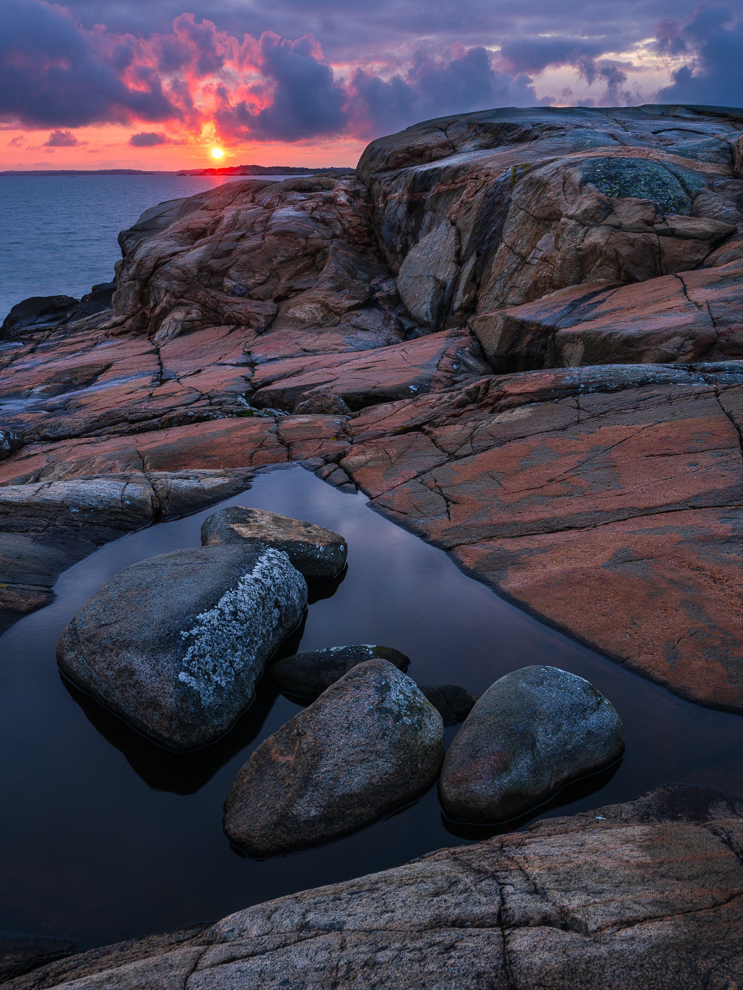 En stämningsfull solnedgång vid Stora Amundön strax utanför Göteborg, där de rundade granithällarna möter havet och himlen färgas i varma kvällstoner. I ett stilla klippkar i förgrunden ligger några stenar spegelblankt i vattnet medan solen sakta sjunker ner mot horisonten över Kattegatt.