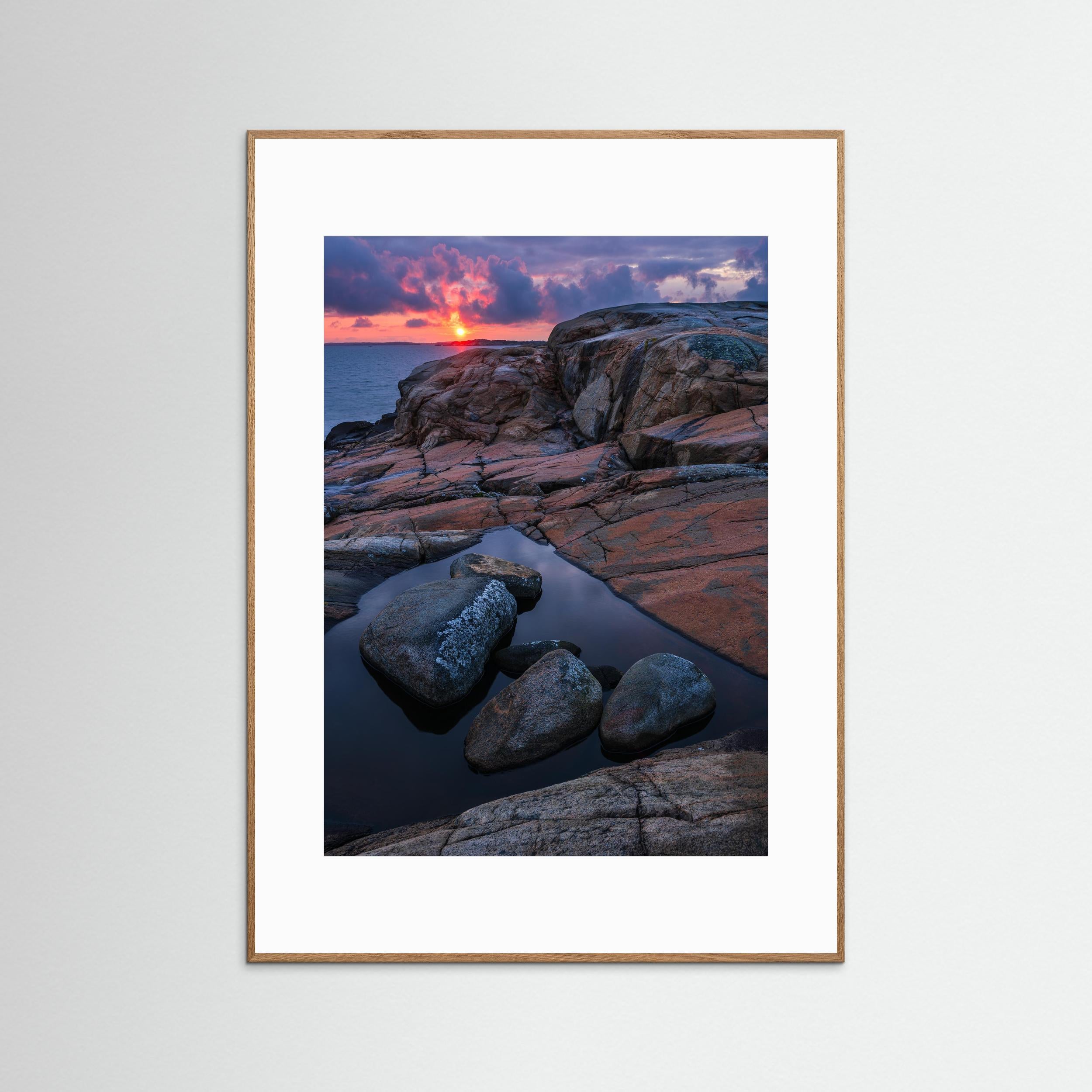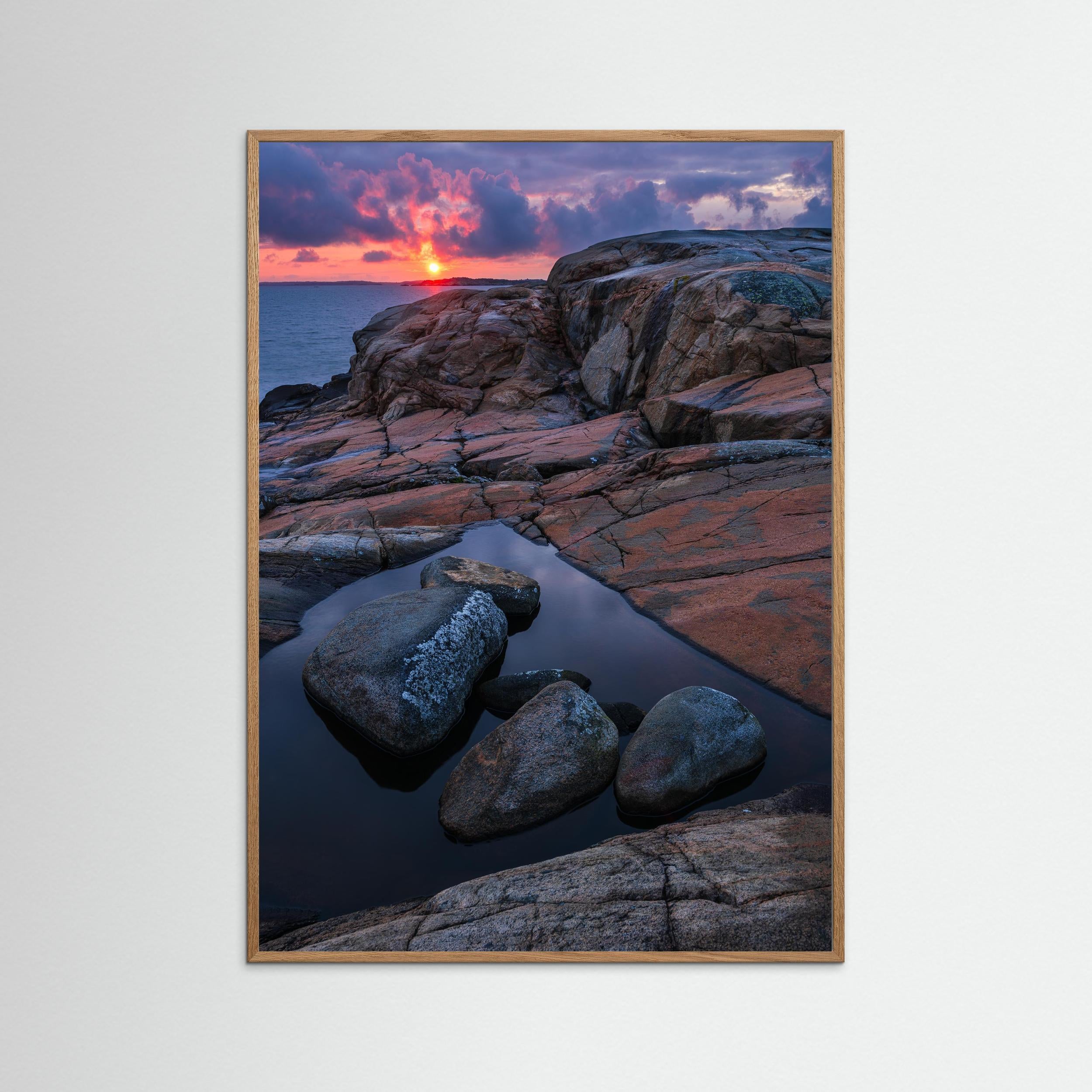 Den här bilden passar utmärkt som fine art print eller canvas för dig som uppskattar svensk kustnatur, dramatiska himlar och stämningsfulla solnedgångar vid havet.