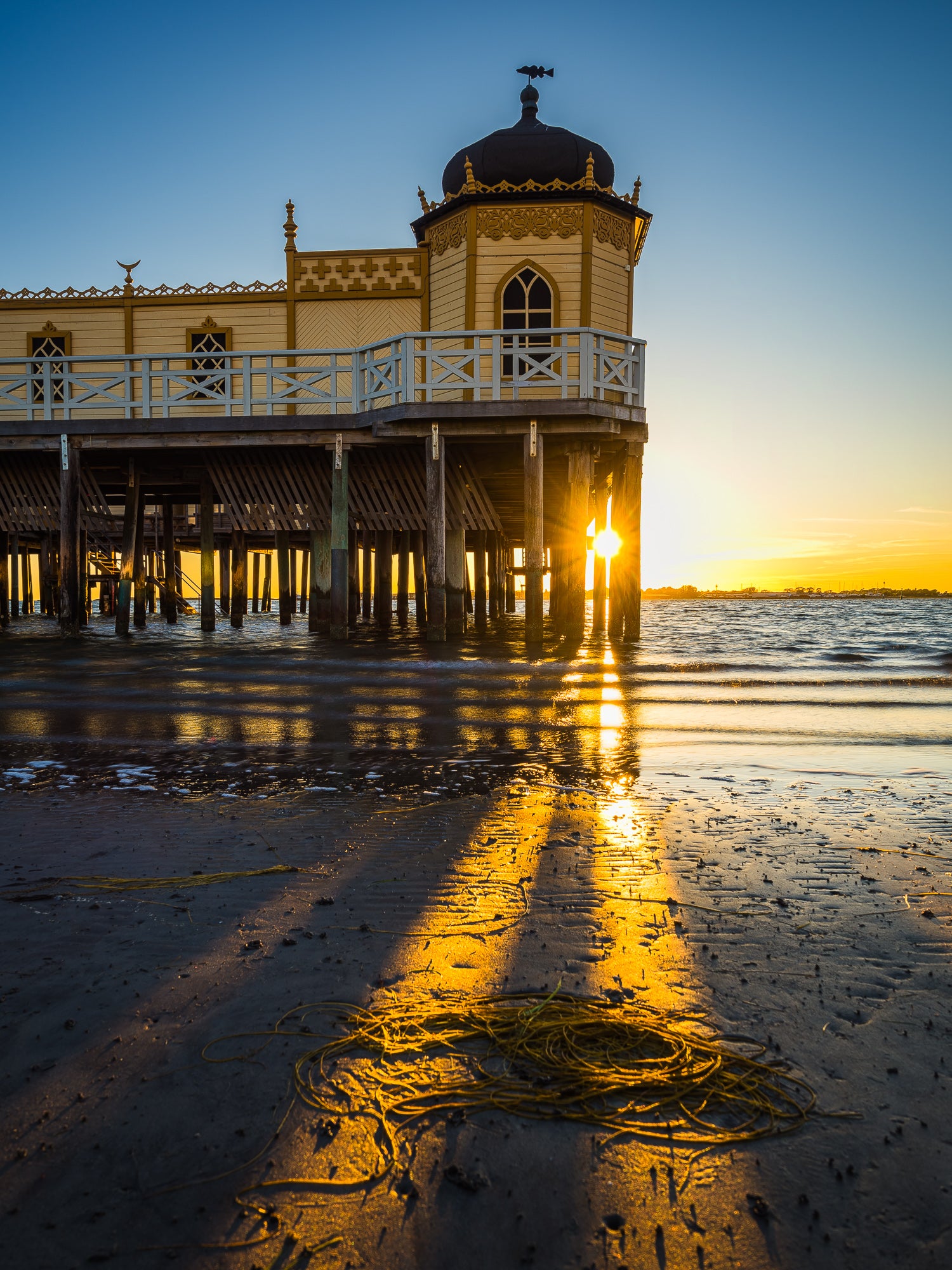 Ett dramatiskt kustmotiv från Varbergs kallbadhus, fotograferat vid solnedgång längs Strandpromenaden i Varberg. Den gyllene kvällssolen lyser genom pelarna under den klassiska byggnaden och reflekteras i den våta sanden vid strandkanten.