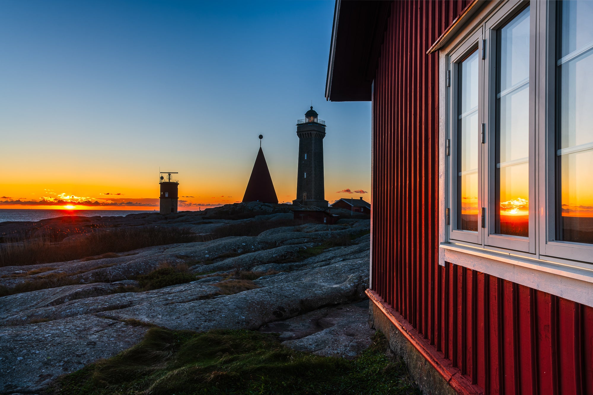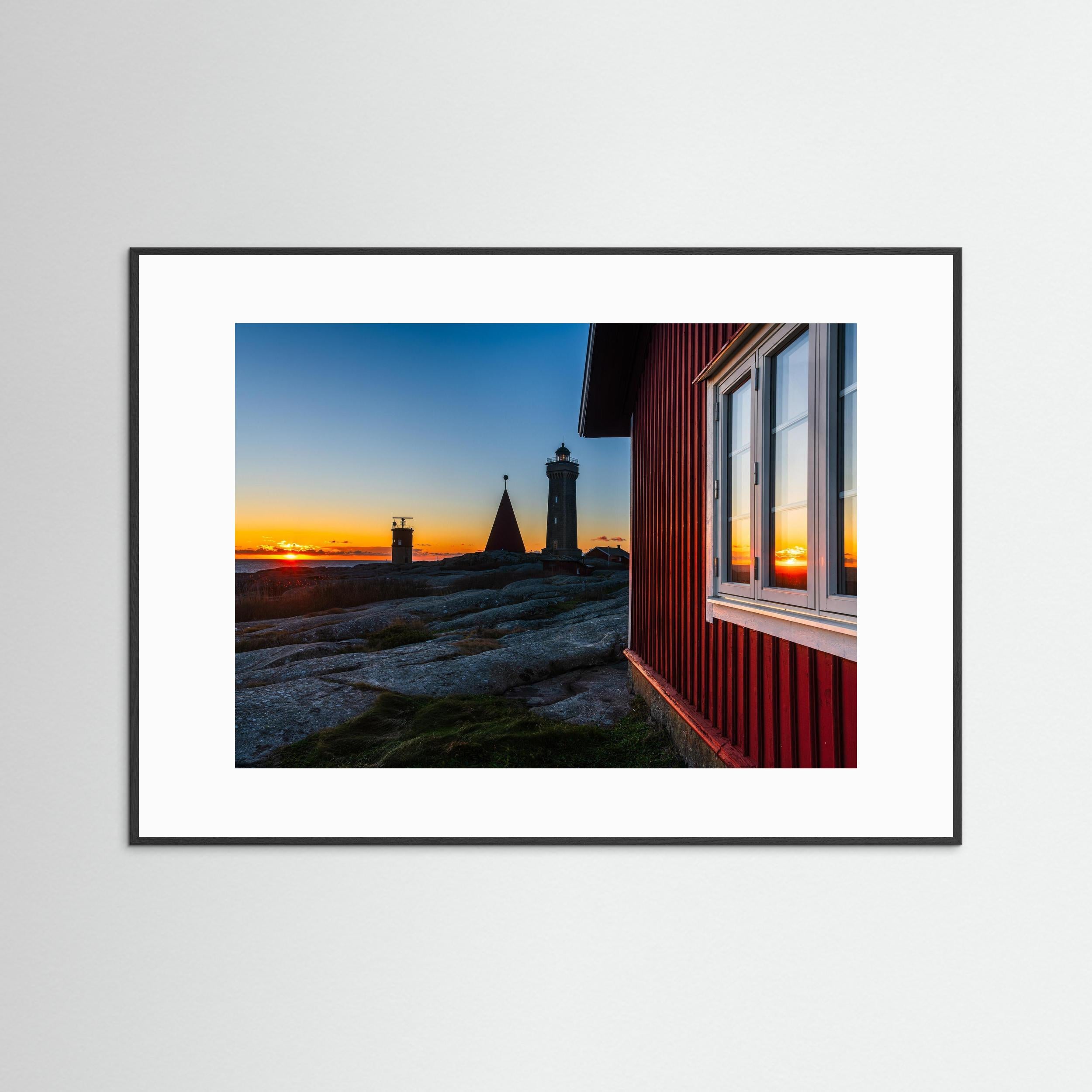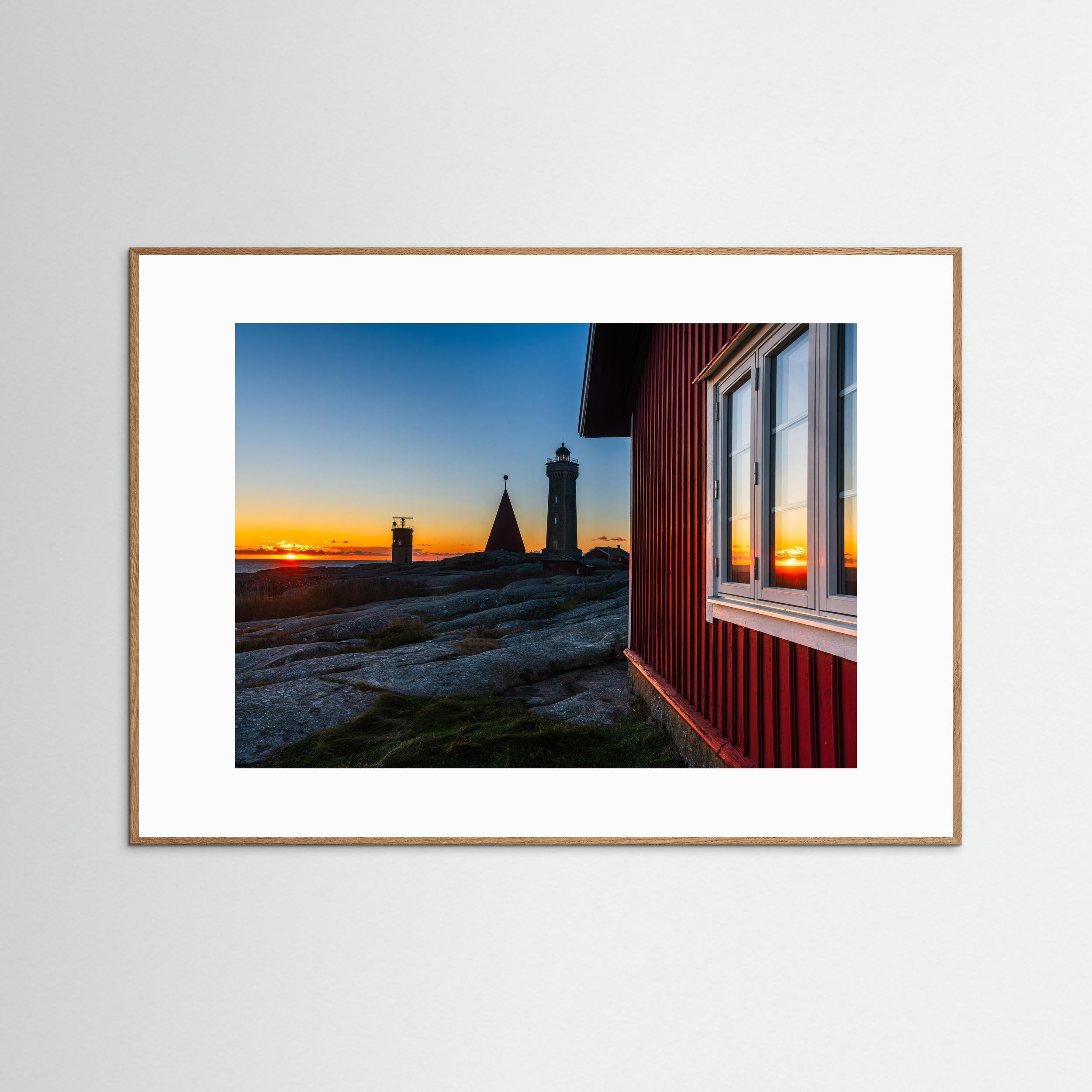 Det varma kvällsljuset speglas i fönstret på den röda byggnaden i förgrunden och leder blicken ut mot fyren och havet. De rundslipade granitklipporna och det öppna havet ger bilden en tydlig känsla av den karga och vackra västkusten.
