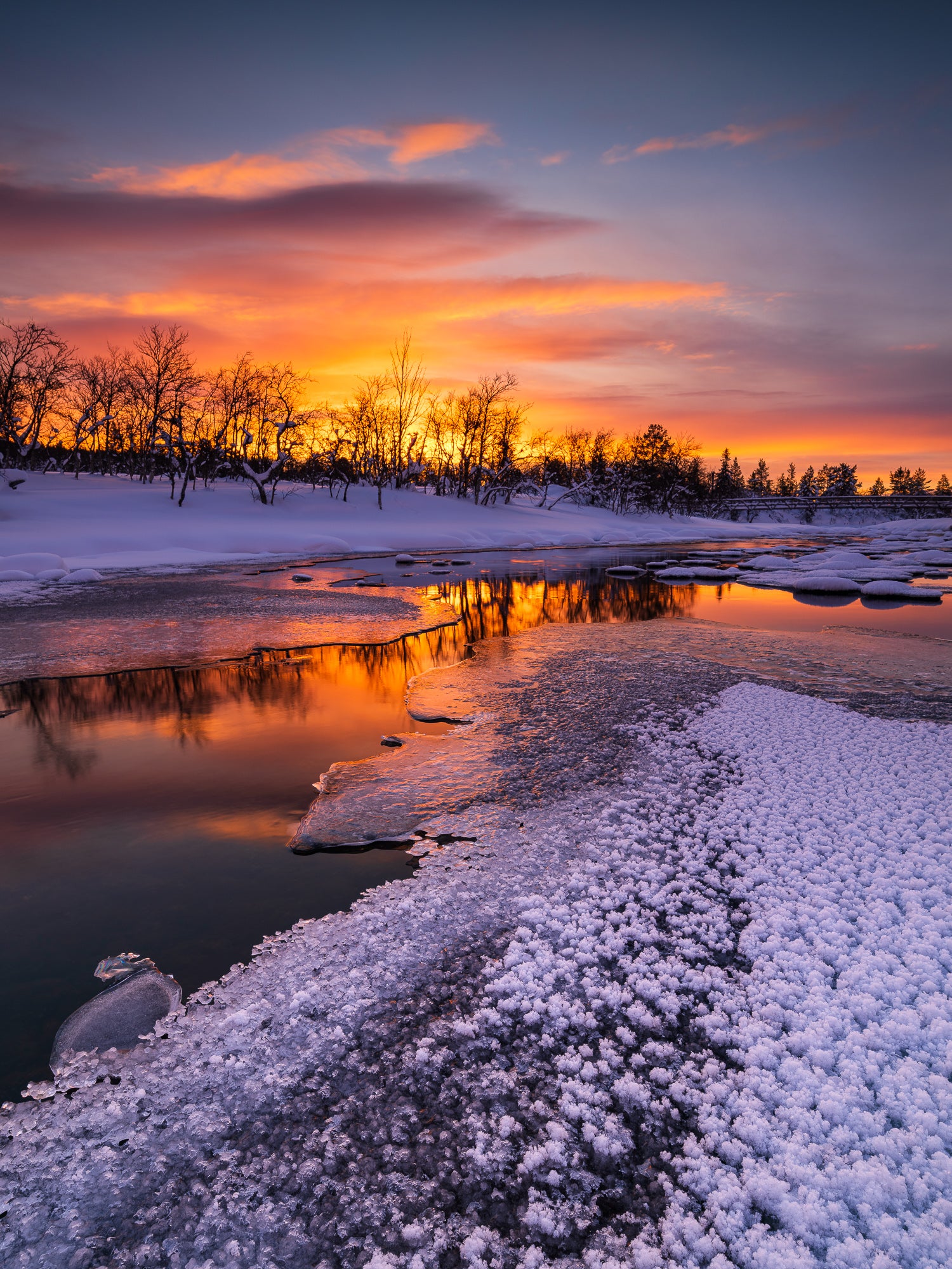 Det slingrande vattendrag, som rinner från sjön Grövelsjön, skär genom det snötäckta landskapet och speglar den glödande kvällshimlen. Isformationer och frostkristaller i förgrunden ger bilden en rik struktur och kontrasterar mot det mjuka ljuset från himlen.
