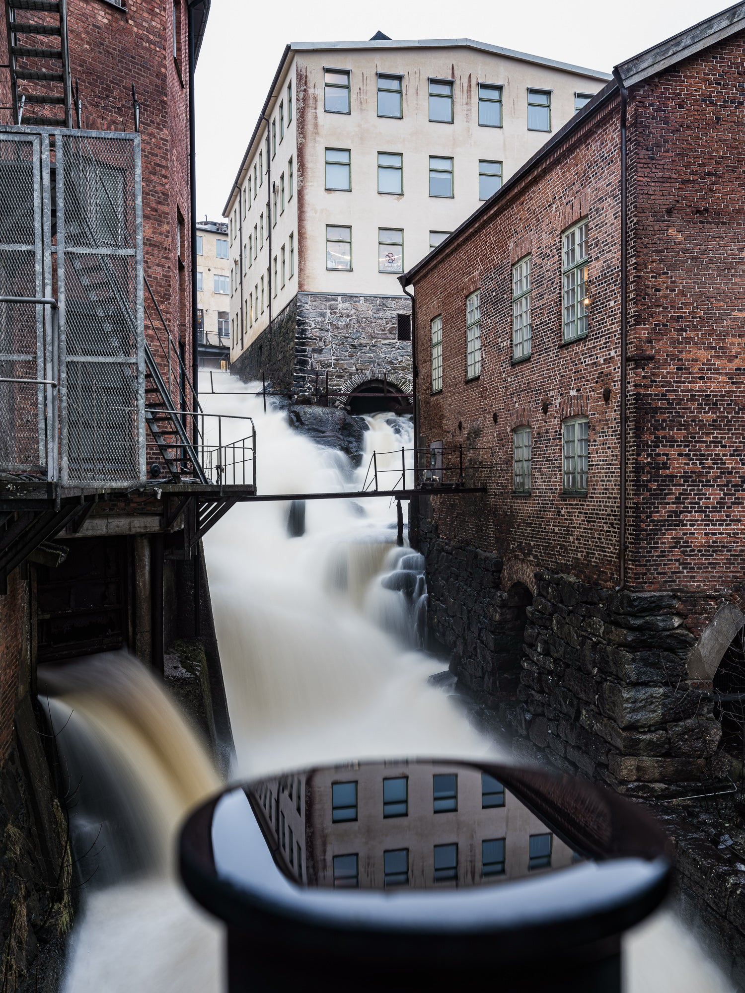 De gamla tegelbyggnaderna och stenmurarna vittnar om områdets långa industrihistoria, medan det strömmande vattnet ger bilden energi och rörelse. Den långa exponeringen mjukar upp vattenflödet och skapar en kontrast mot de robusta byggnaderna runt omkring.