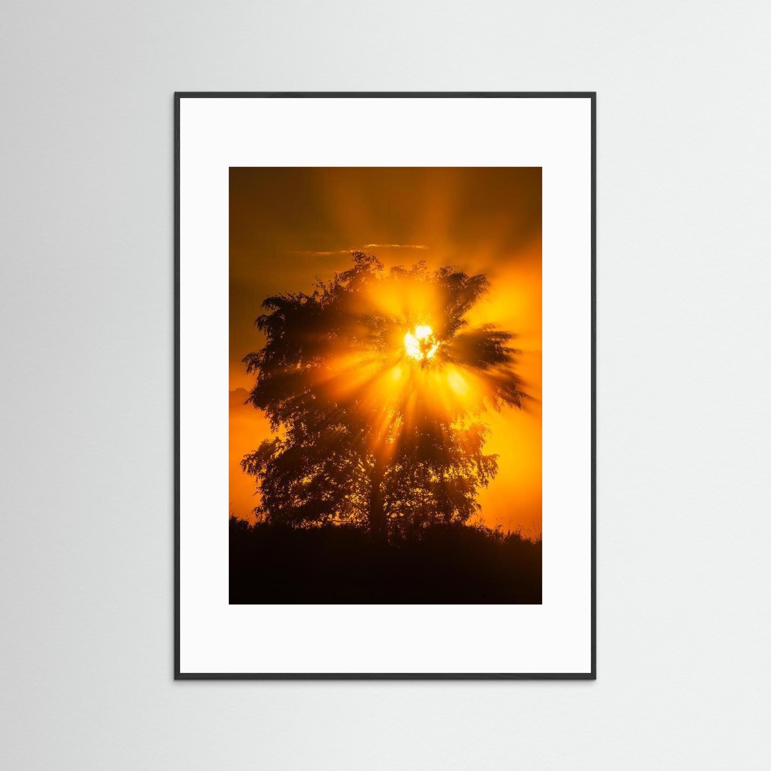 Fotograferad en dimmig höstdag utanför Lindome i Mölndals Stad. Det första ljuset bryter fram genom trädkronan och sprider sina strålar över landskapet. Ett stilla ögonblick där mörker och ljus möts, och dagen långsamt tar form.