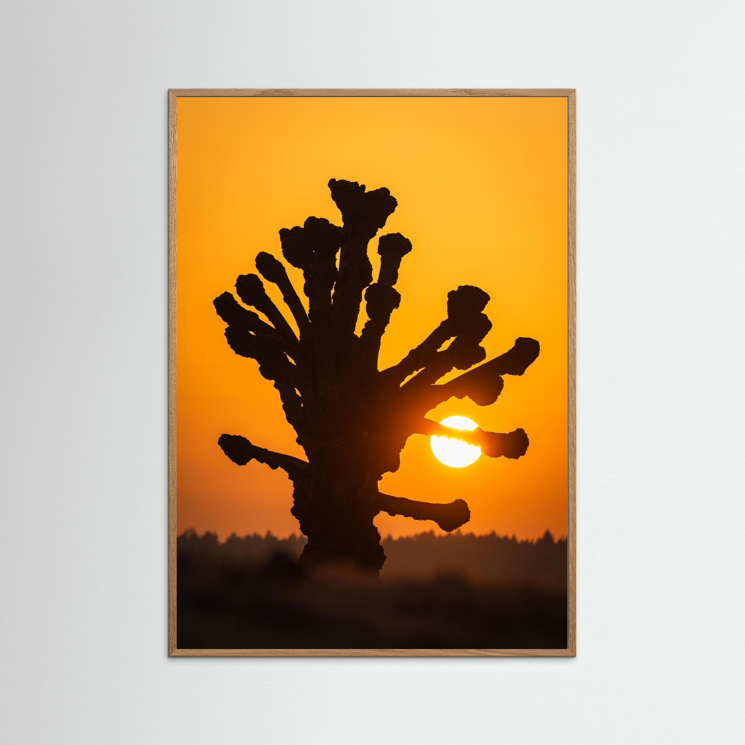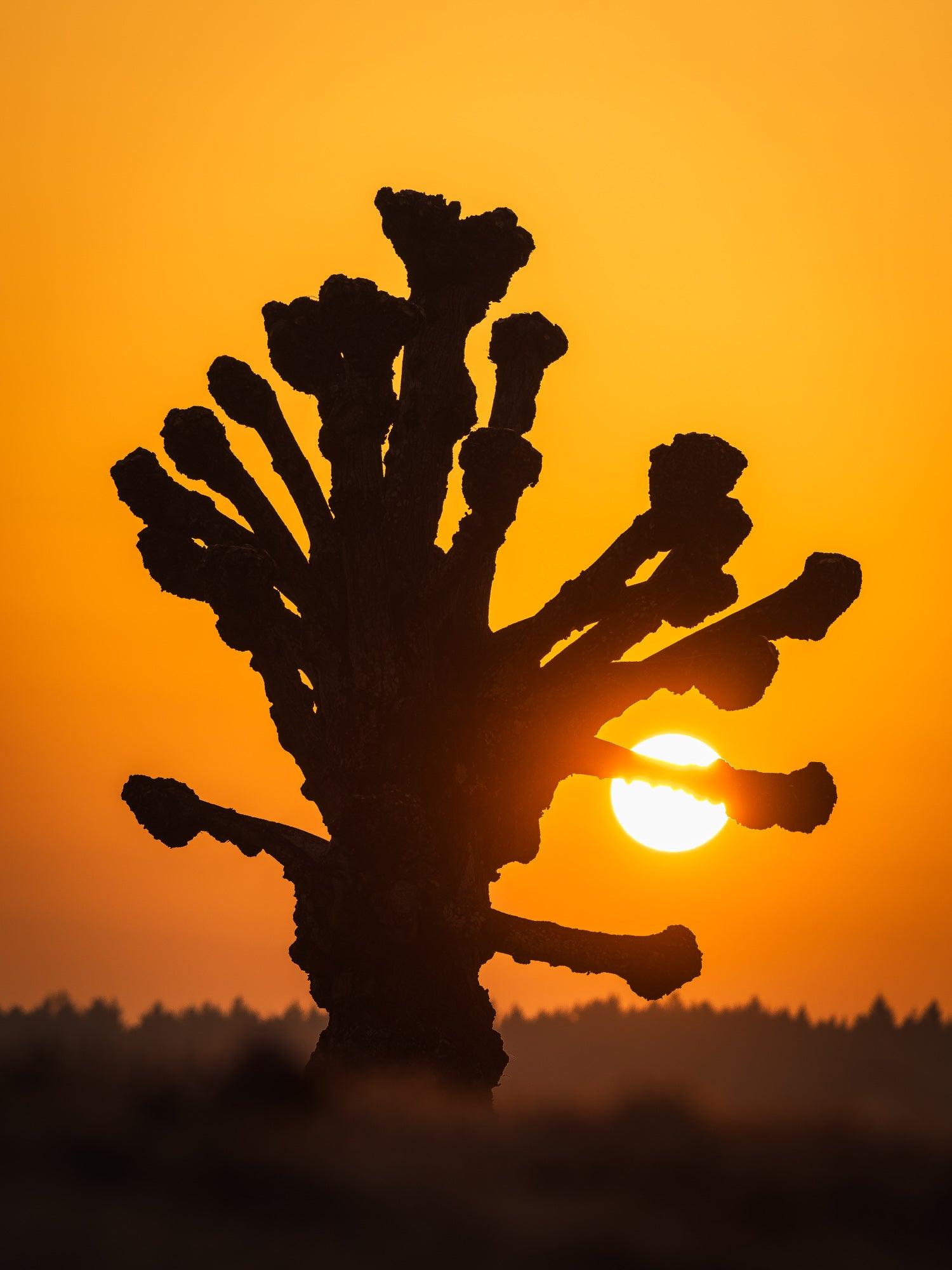 I bilden syns en av de karakteristiska hamlade lindarna i silhuett mot den varma morgonhimlen. Solen stiger upp bakom trädet och skapar ett dramatiskt motljus där grenarnas former framträder tydligt mot himlen.