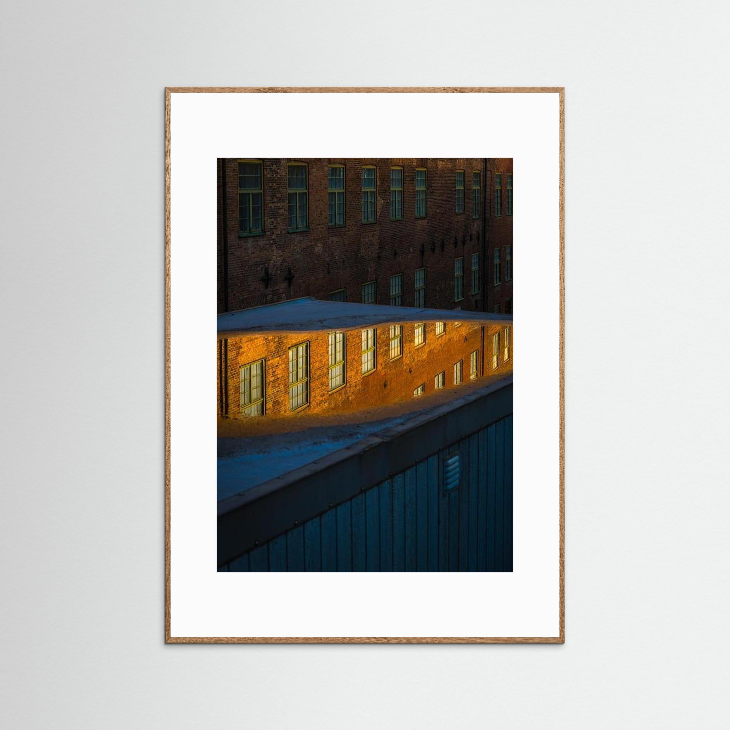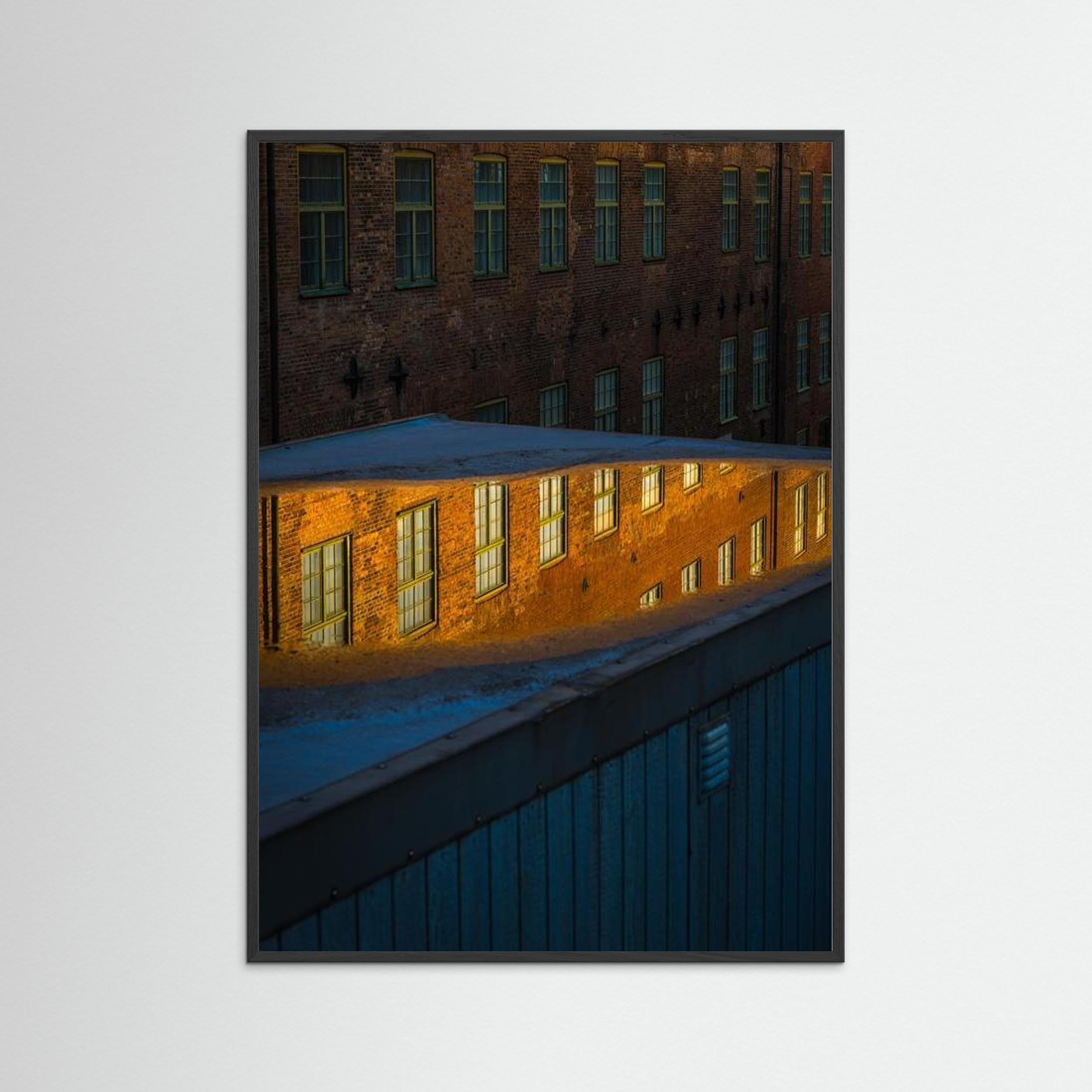 Fotograferad i Mölndals Kvarnby. Den gamla industrifasadens fönster fångas i en stilla vattenpöl medan kvällssolen värmer teglet i gyllene toner. Ett ögonblick där historia och nutid möts i ljusets reflektion.