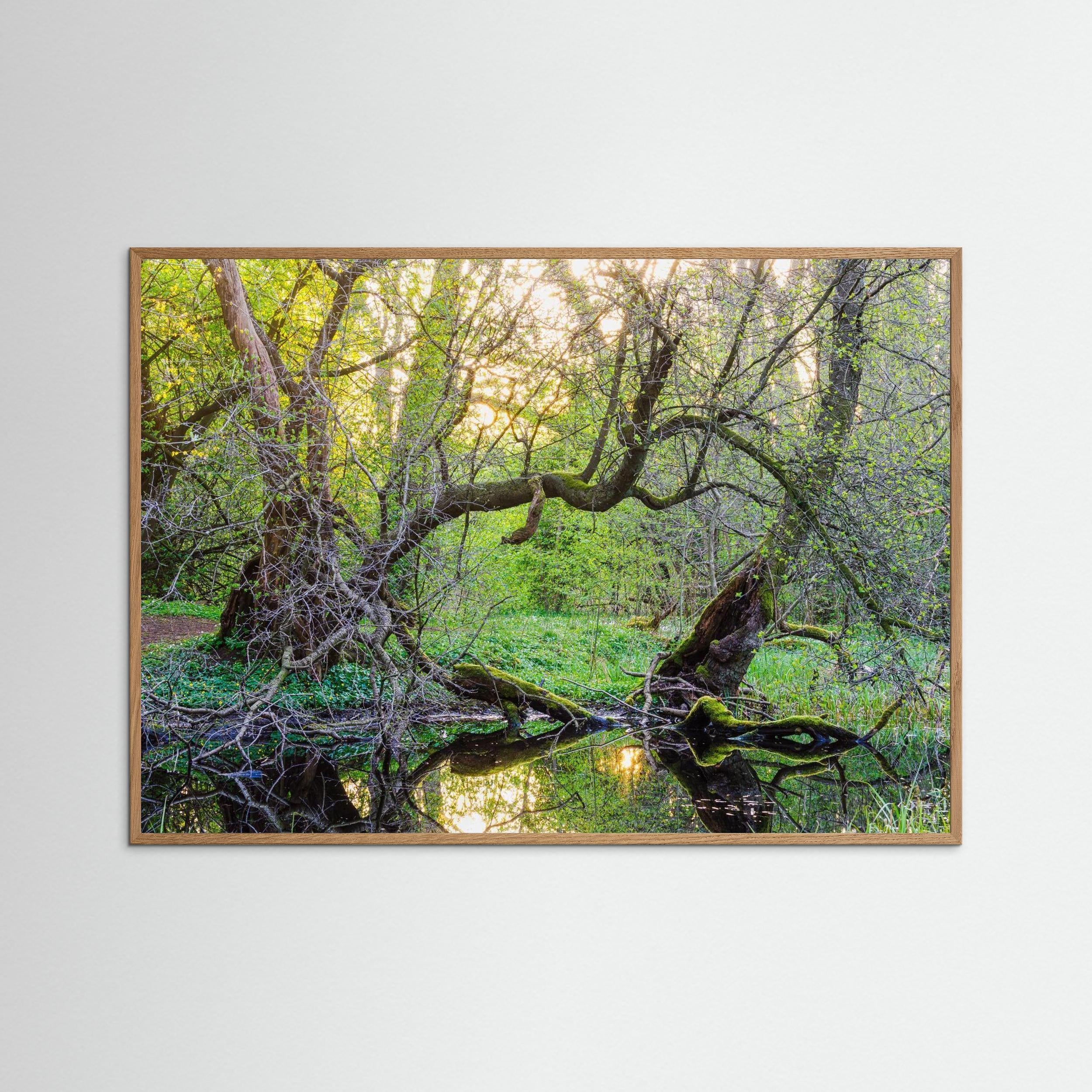 Fotograferad en vårdag i Rya skog naturreservat i Göteborg. Gamla träd sträcker sig lågt över det stilla vattnet, där ljuset speglas mellan rötter och grenar. En plats där mark och vatten möts, där tiden saktar in och naturen vilar i sin egen rytm.