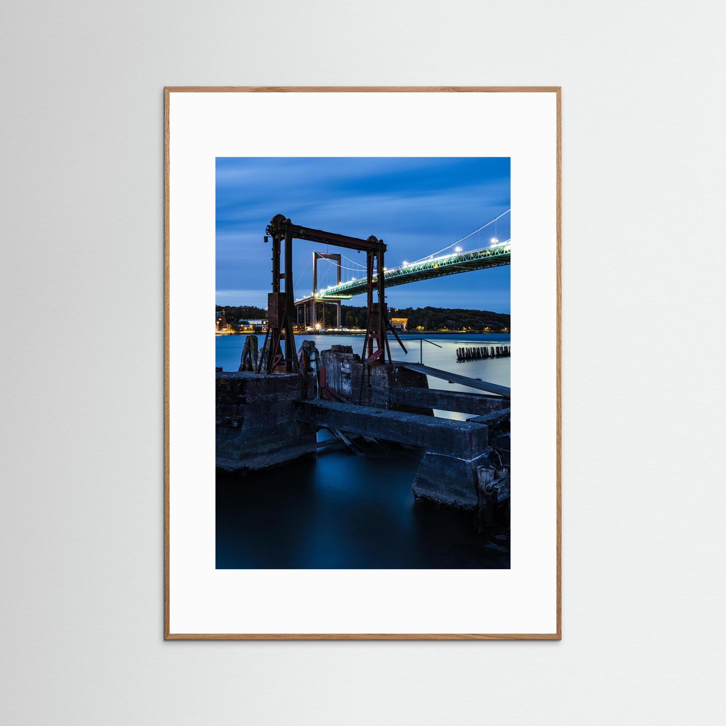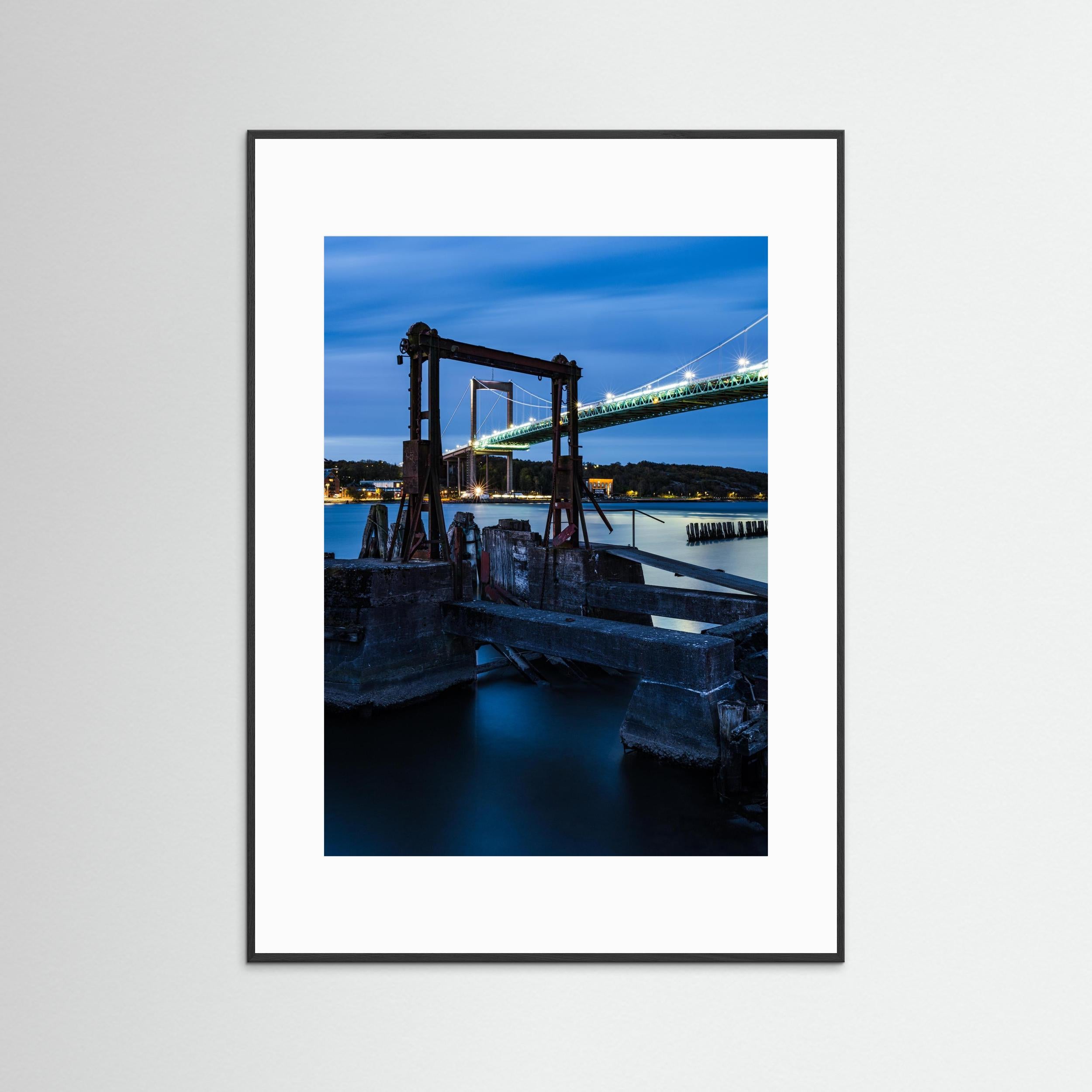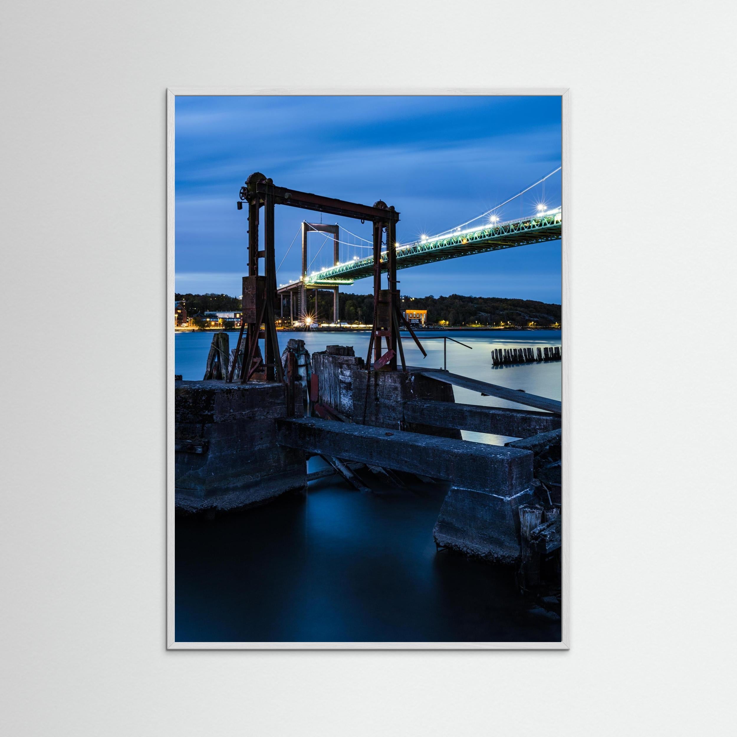 Motivet passar utmärkt som fine art print eller canvas och fungerar särskilt bra i större format där detaljerna i både bron och den gamla färjekonstruktionen framträder tydligt. Fotograferad 19 oktober vid Färjenäs, Hisingen i Göteborg.