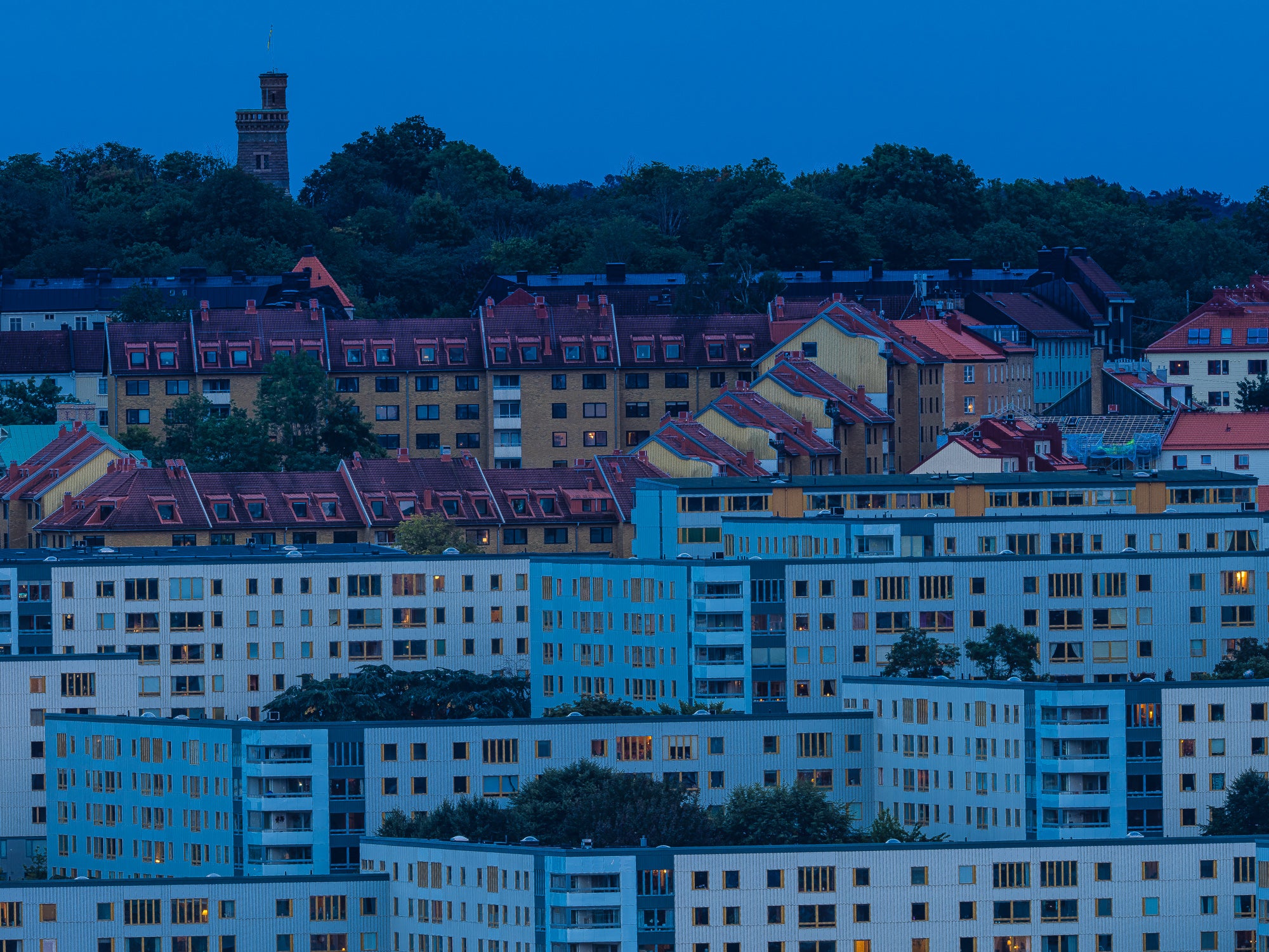 Detta stadslandskap visar Masthugget i Göteborg i kvällsljus, med det klassiska vattentornet i Slottsskogen synligt i bakgrunden.