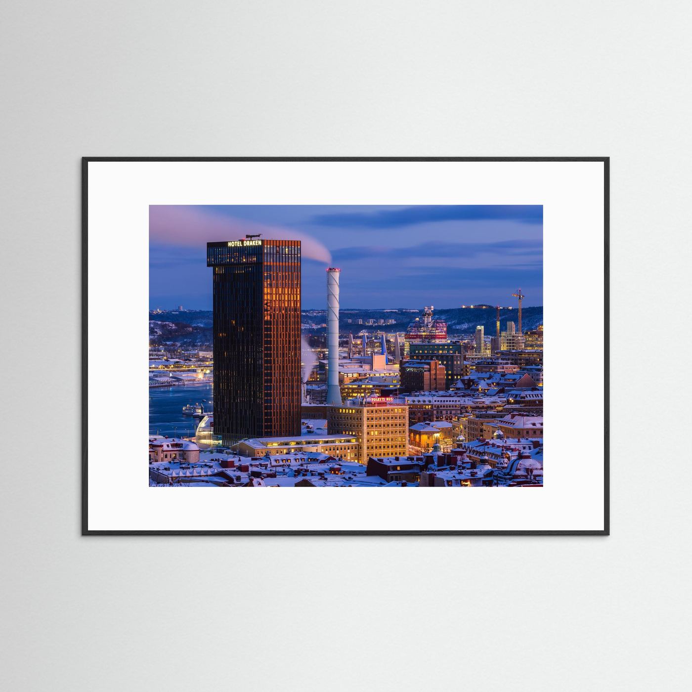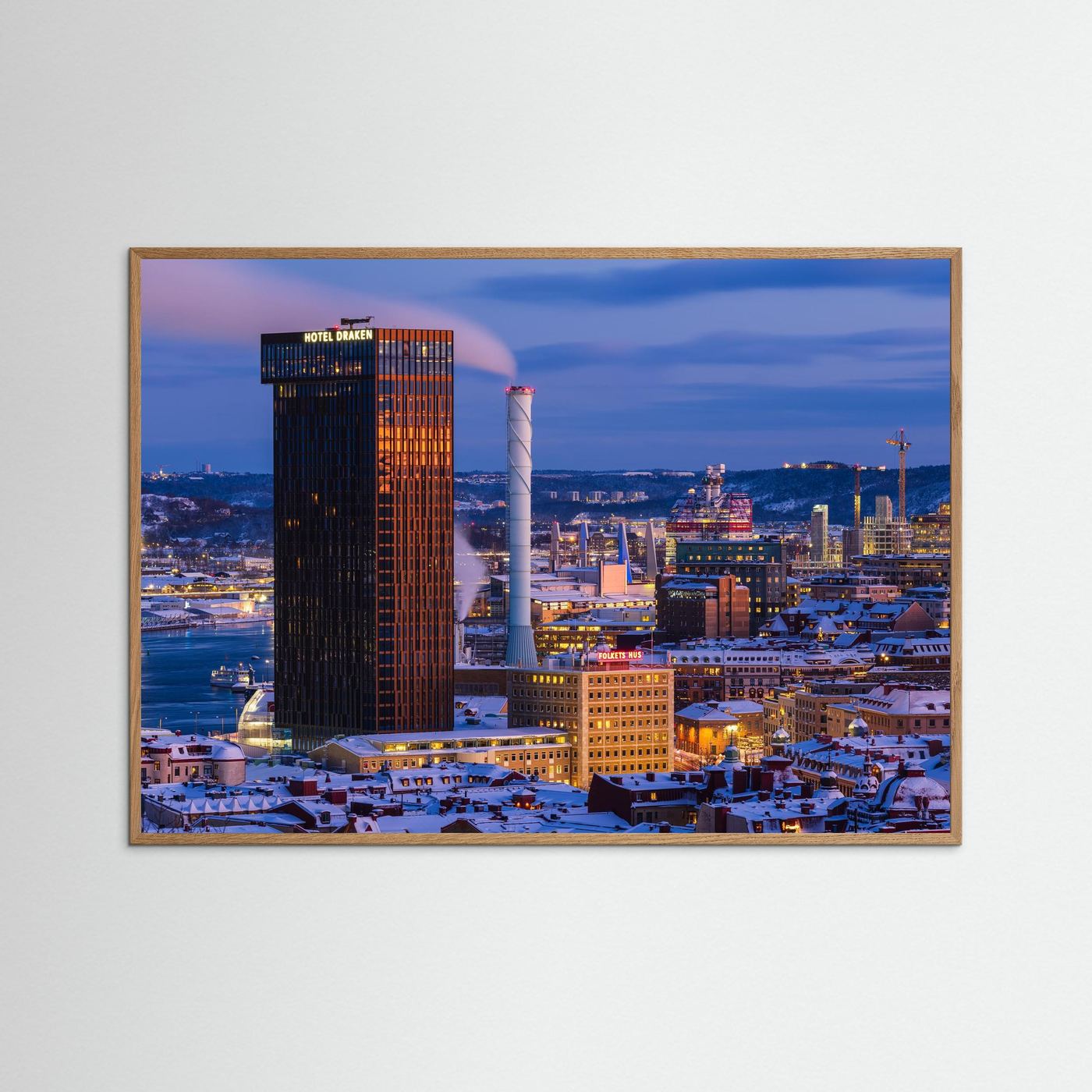 En detaljrik och stämningsfull fine art-bild från centrala Göteborg där stadens karaktär fångas i vinterljus. I motivet syns flera av stadens mest ikoniska byggnader, där Clarion Hotel Draken reser sig över de snötäckta taken tillsammans med Folkets hus, Hisingsbron och Läppstiftet.