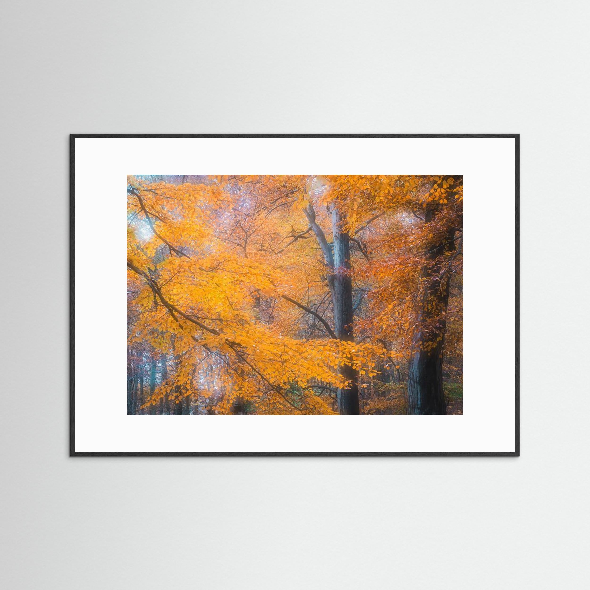 De varma höstfärgerna i bokarnas lövverk kontrasterar mot de mörka stammarna och skapar ett djup och en mjukhet som för tankarna till en målning. Ljuset silas genom grenarna och ger bilden en nästan drömlik karaktär.
