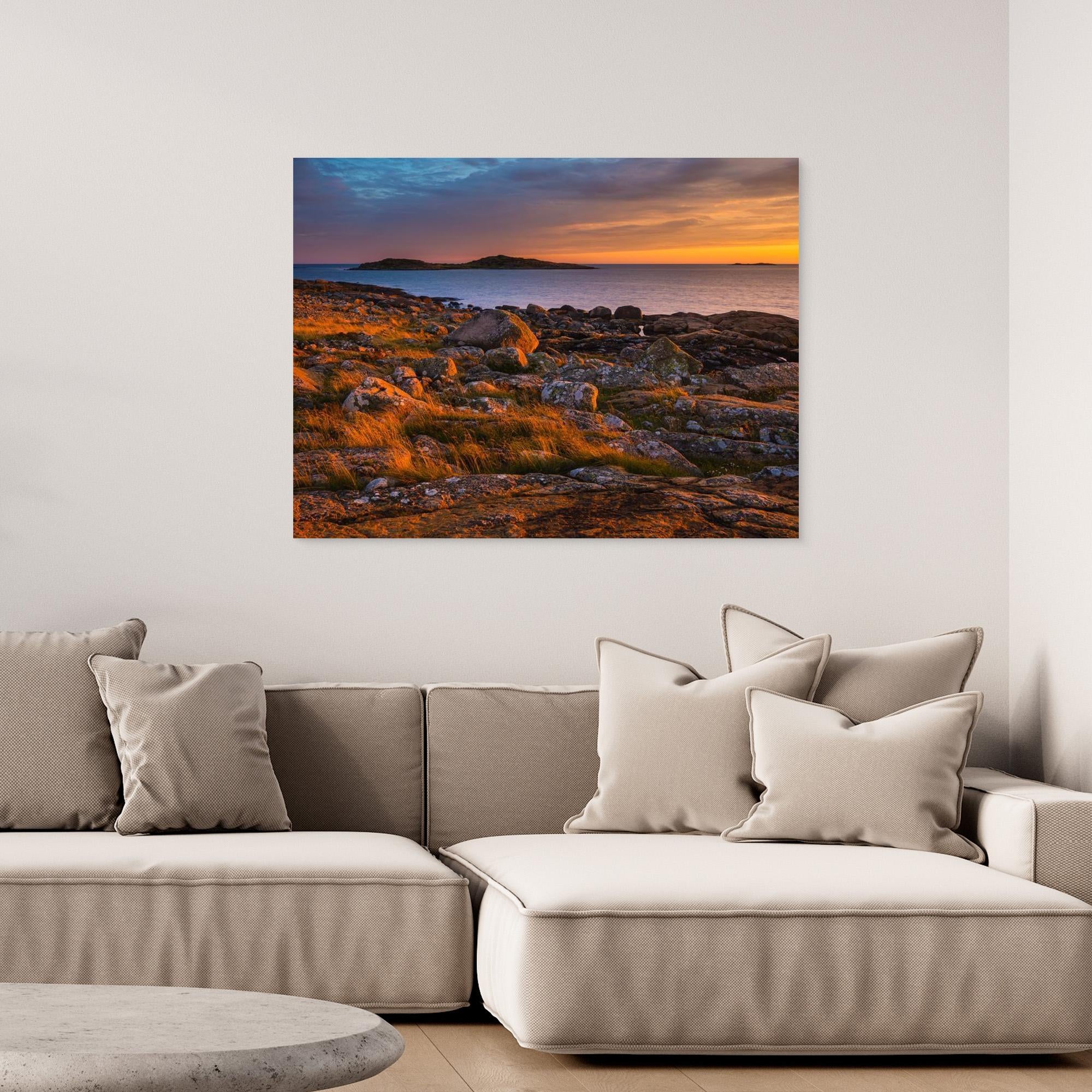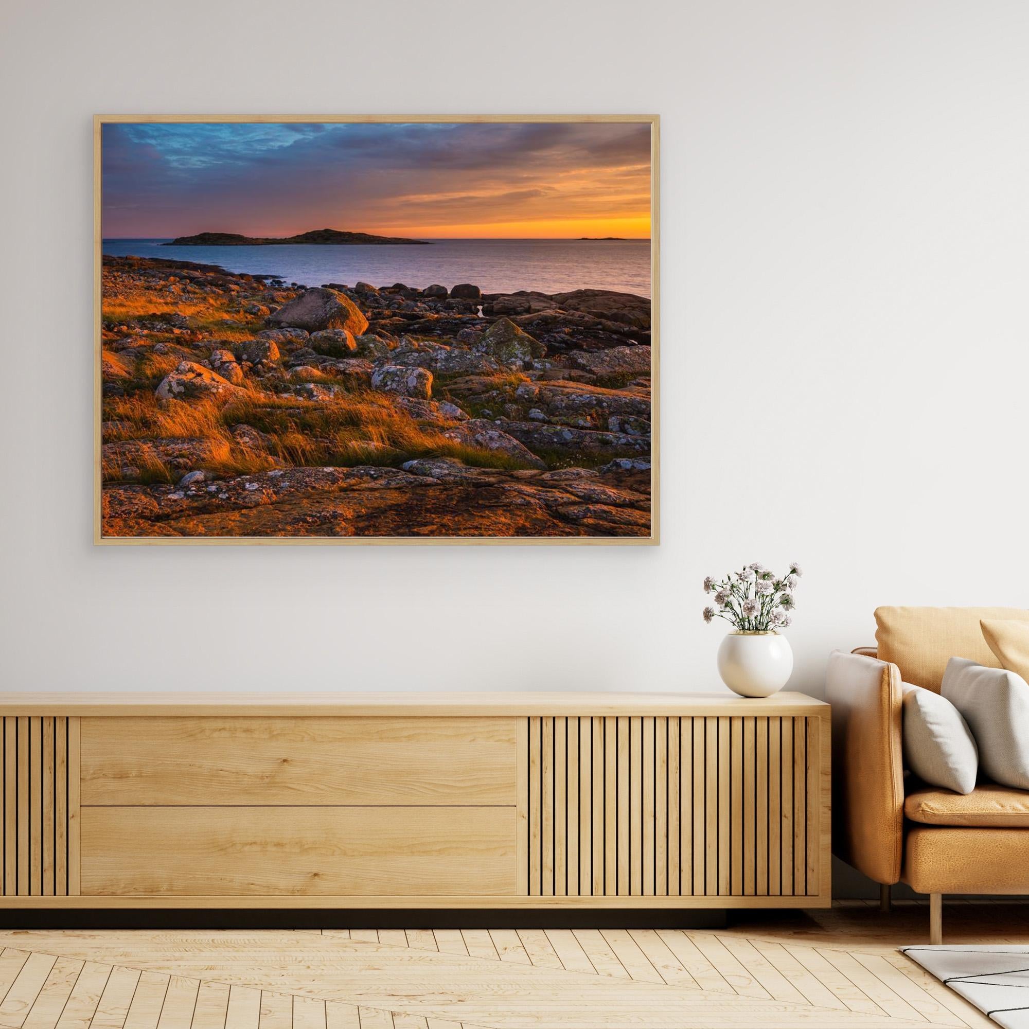 Solnedgångens gyllene strålar sveper över stenarna och det torra gräset och skapar en rik kontrast mot havets svalare toner och himlens mjuka färgskiftningar. Landskapet är öppet, stilla och tidlöst – en plats där naturen får tala utan dramatik, men med stark närvaro.