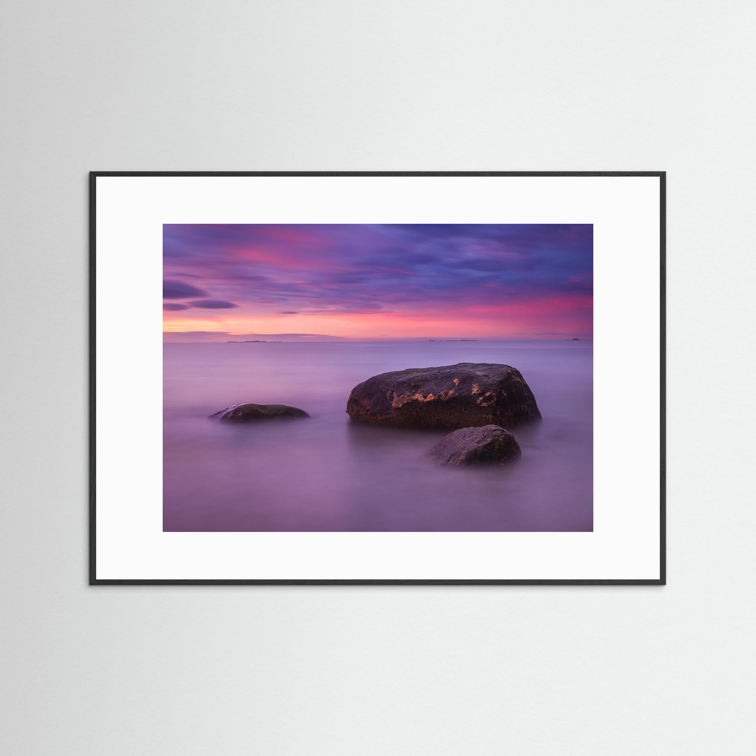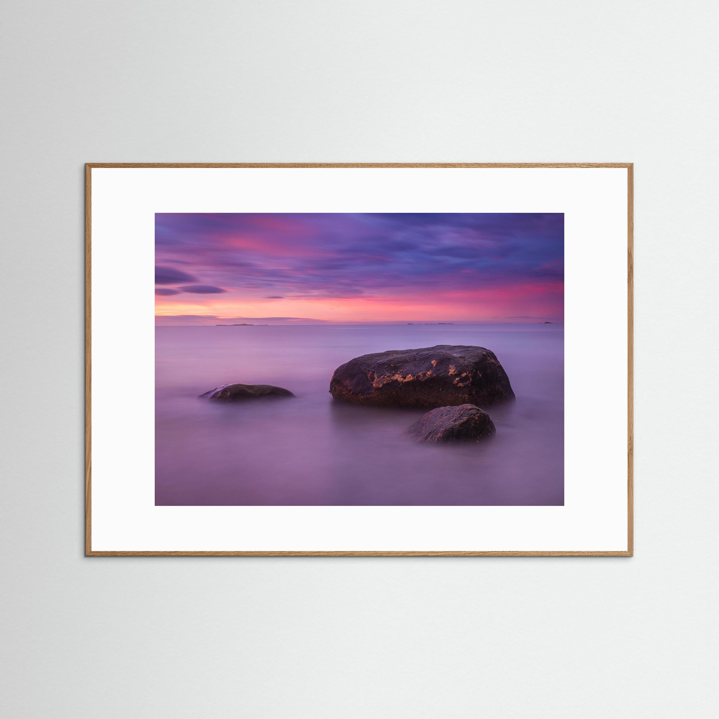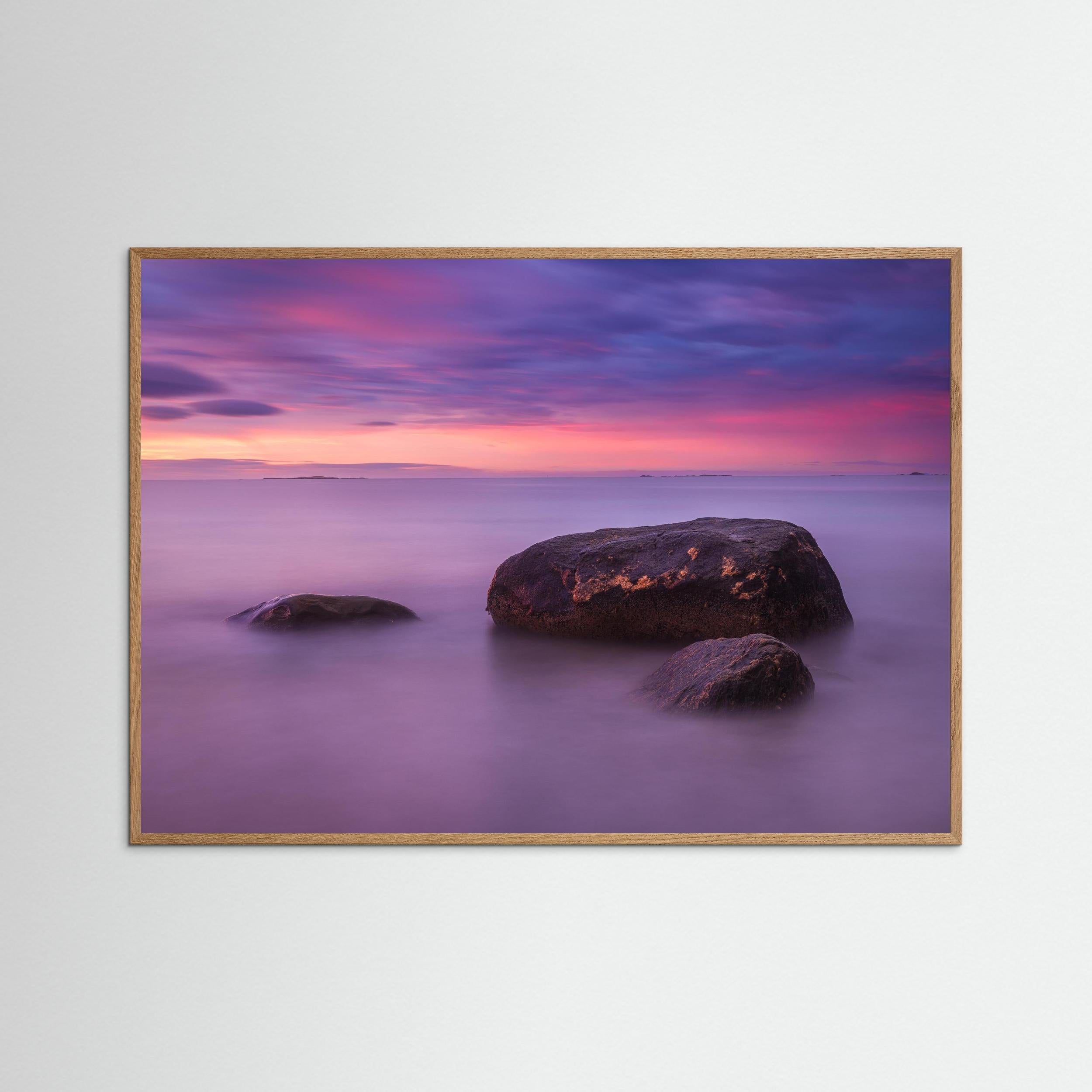 Motivet förmedlar nordisk kustnatur i sin mest stillsamma form – där hav och himmel möts i harmoniska toner av rosa, lila och blått.