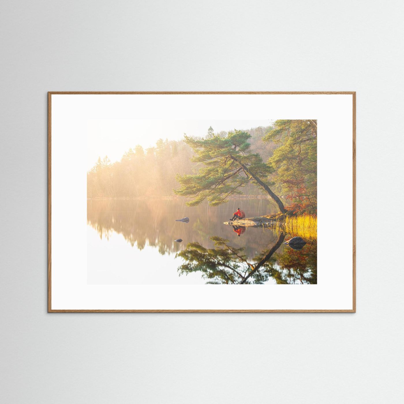Stillhet vid Kåsjön är ett fine art fotografi från en dimmig novembermorgon vid Stora Kåsjön i Partille. Bilden fångar ett ögonblick av total ro, där en ensam gestalt sitter vid vattnet omgiven av mjukt ljus och spegelblanka reflektioner.