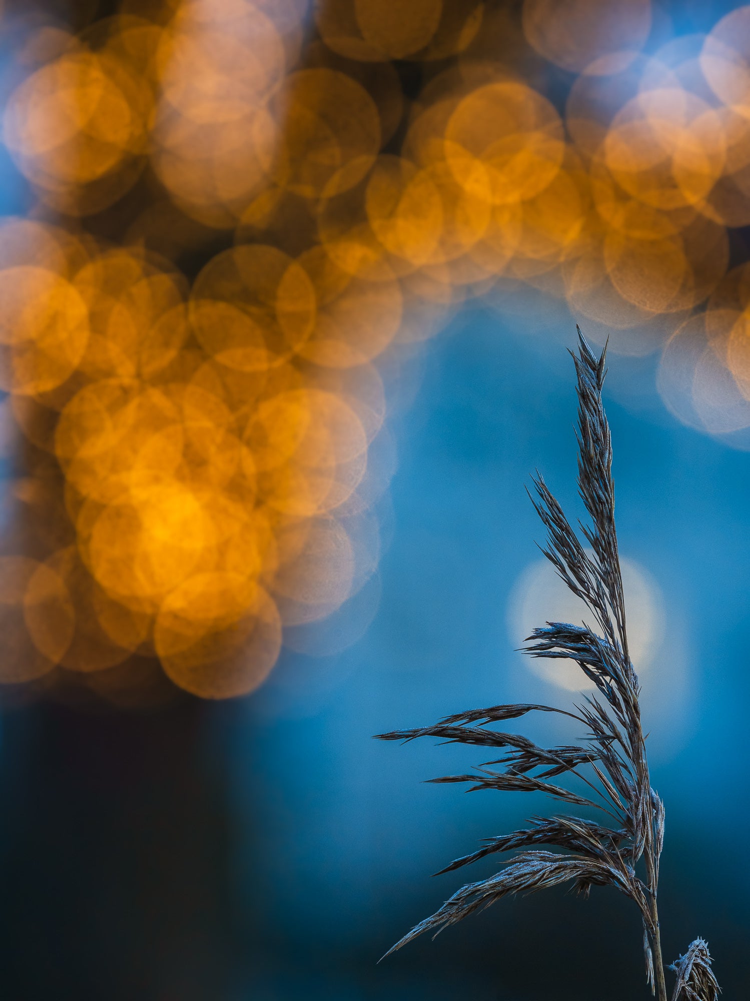 Ett stämningsfullt och minimalistiskt motiv fotograferat den 20 november vid Råda Säteri i Härryda kommun. Ett ensamt vassstrå står i skarp kontrast mot bakgrundens mjuka, gyllene julbelysning som bildar vackra bokeh-cirklar.