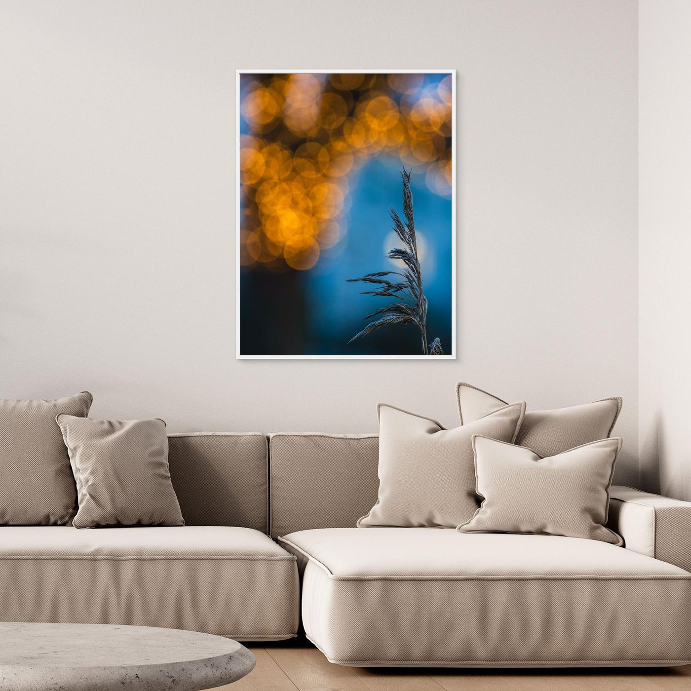 Färgkombinationen av varma toner och svala blå nyanser skapar en harmonisk balans mellan ljus och mörker, vilket ger bilden ett lugnt men samtidigt levande uttryck.